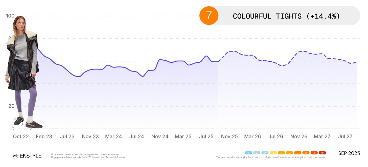 After a major SS26 runway resurgence, tights are evolving to become a key accessory for expressive layering for the colder months. For stark monochromatic looks inspired by Tibi or a contrasting clash seen from Marine Serre, tights have been used across designers to embed personality into a look.